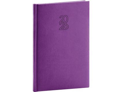 týdenní diář Aprint 2026 ve fialové barvě • kolekce vsadila na osvědčené barvy, které doplňuje nová ražba letopočtu • týdenní rozvrh s česko-slovenským kalendáriem a doplňkovou...