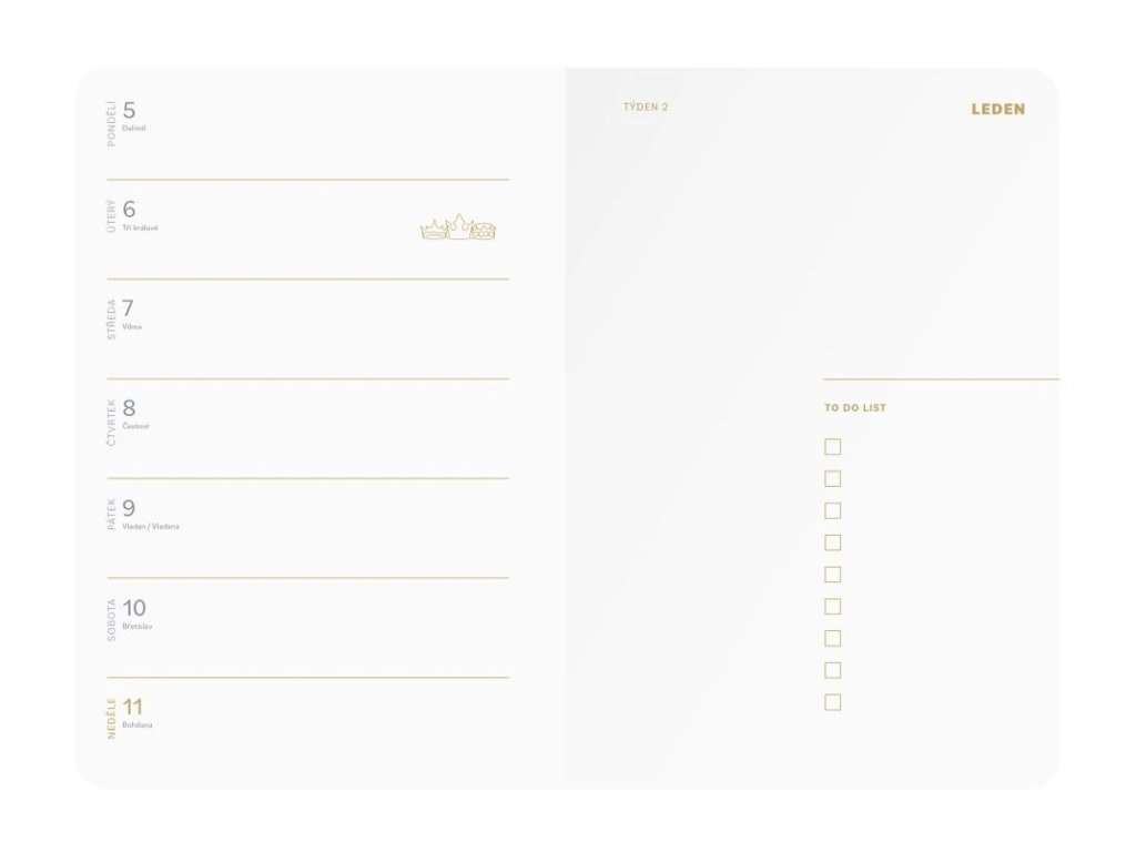 týdenní diář • formát lady size 130 x 190 mm • 180 stran • 80 g papír • prostor pro vaše přání a priority • strany pro plány a vize na rok 2026 v osobním i pracovním životě • přehledový kalendář • plánovací kalendář • týdenní kalendárium • To Do list pro každý týden • zhodnocení měsíce • kruh rovnováhy • aktivity tracker • motivační citáty • prostor pro tipy na knihy, filmy, výlety • strany pro seznamy věcí, co nezapomenout • prostor pro tipy na dárky • poznámky • samolepky • PVC kapsa na přední desce • záložková stužka • gumička na zavření • materiál desek: koženska se sleporažbou • 26-LAD-090PLU: 18016