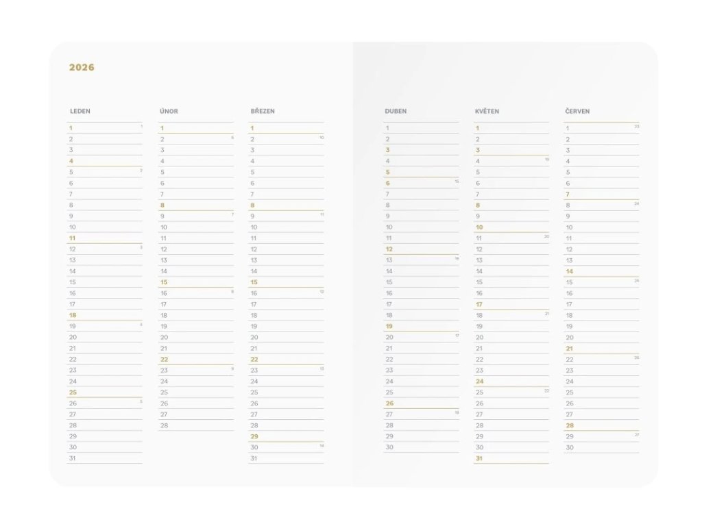 týdenní diář • formát lady size 130 x 190 mm • 180 stran • 80 g papír • prostor pro vaše přání a priority • strany pro plány a vize na rok 2026 v osobním i pracovním životě • přehledový kalendář • plánovací kalendář • týdenní kalendárium • To Do list pro každý týden • zhodnocení měsíce • kruh rovnováhy • aktivity tracker • motivační citáty • prostor pro tipy na knihy, filmy, výlety • strany pro seznamy věcí, co nezapomenout • prostor pro tipy na dárky • poznámky • samolepky • PVC kapsa na přední desce • záložková stužka • gumička na zavření • materiál desek: tištěný potah, lamino soft touch • zlatá ražba • 26-LAD-094PLU: 18015