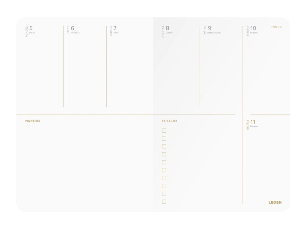 týdenní diář • formát A5 (148 x 210 mm) • 240 stran • 80 g papír • prostor pro přehled a vize na rok 2026 • strategické plánování dlouhodobých i krátkodobých cílů podle metody SMART • přehledový kalendář • měsíční plánovače • týdenní kalendárium • To Do list pro každý týden • aktivity tracker za každým měsícem • efektivní zhodnocení každého měsíce • zhodnocení roku 2026 • prostor pro tipy na knihy, filmy, výlety • strany pro seznamy věcí, co nezapomenout • prostor pro tipy na dárky • poznámky • PVC kapsa na přední desce • samolepky• materiál desek: tištěný potah, lamino touch • černá ražba • 26-SMA5-097PLU: 18021
