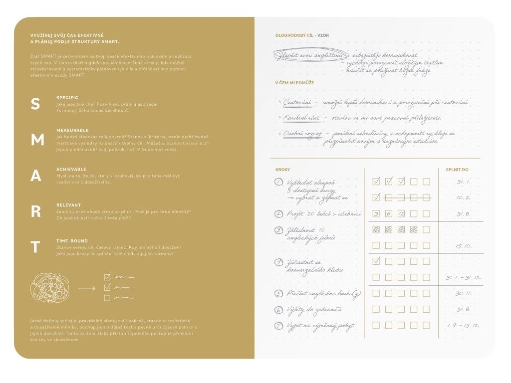 týdenní diář • formát A5 (148 x 210 mm) • 240 stran • 80 g papír • prostor pro přehled a vize na rok 2026 • strategické plánování dlouhodobých i krátkodobých cílů podle metody SMART • přehledový kalendář • měsíční plánovače • týdenní kalendárium • To Do list pro každý týden • aktivity tracker za každým měsícem • efektivní zhodnocení každého měsíce • zhodnocení roku 2026 • prostor pro tipy na knihy, filmy, výlety • strany pro seznamy věcí, co nezapomenout • prostor pro tipy na dárky • poznámky • PVC kapsa na přední desce • samolepky• materiál desek: koženka s jemným perleťovým efektem • stříbrná ražba • 26-SMA5-093PLU: 18019