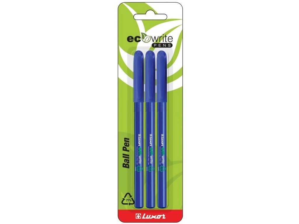 kuličková pera • jednorázová • s víčkem • barva víčka odpovídá barvě náplně • 70 % použitého plastu je z recyklovaného polypropylenu • certifikováno Global Recycled Standard pro udržitelnou výrobu • kónický hrot průměr 1 mm • stopa 0,8 mm • inkoust s nízkou viskozitou: plynulejší a hladší psaní, menší úsilí při psaní • rychleschnoucí – snižuje riziko rozmazání, jasné a výrazné line pro skvělou čitelnost • kvalitní, stylové a pohodlné pero pro každodenní psaní • Luxor 540/3BC modrá • baleno na blistruPLU: 12705