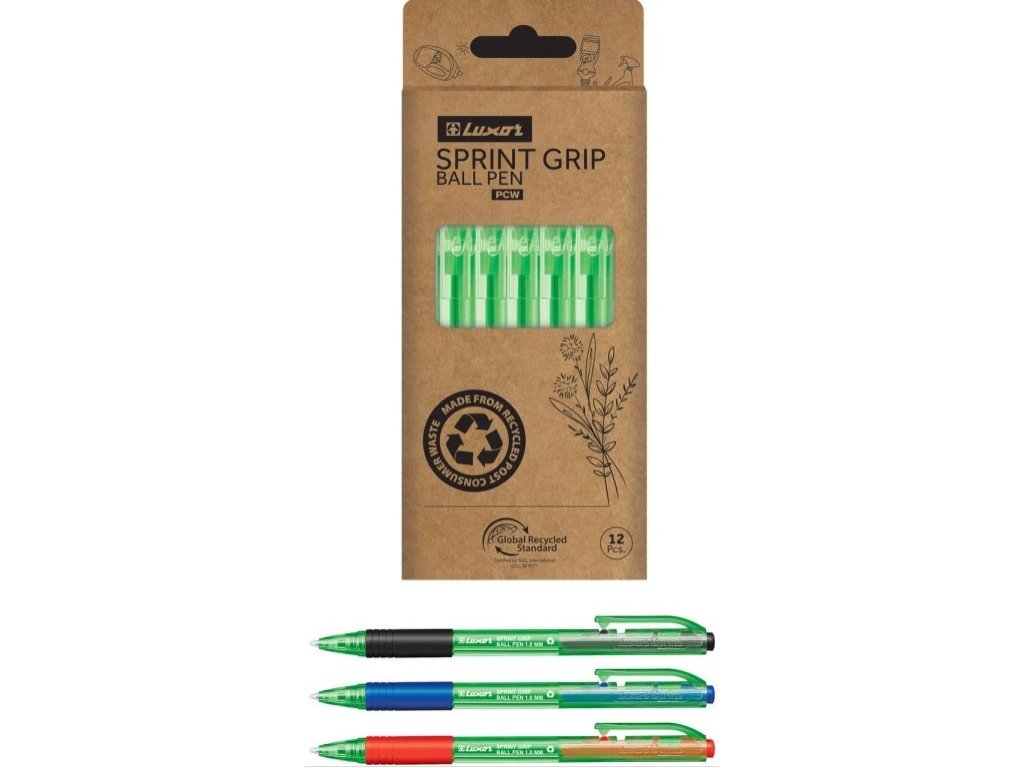 ekologická kuličková pera • jednorázová • stiskací mechanismus • ergonomický design pro pohodlné držení s pogumovaným gripem • barva doplňků odpovídá barvě náplně • kónický hrot, průměr 1 mm • stopa 0,7 mm • inkoust s nízkou viskozitou: plynulejší a hladší psaní, menší námaha při psaní • rychleschnoucí – snižuje riziko rozmazání, jasné a výrazné linie pro skvělou čitelnost • certifikováno Global Recycled Standard pro udržitelnou výrobu • set obsahuje 10 kusů s modrou, po 1 kuse s černou a červenou náplní • Luxor PCW520/12BX mix barev • 12 ks v baleníPLU: 17107