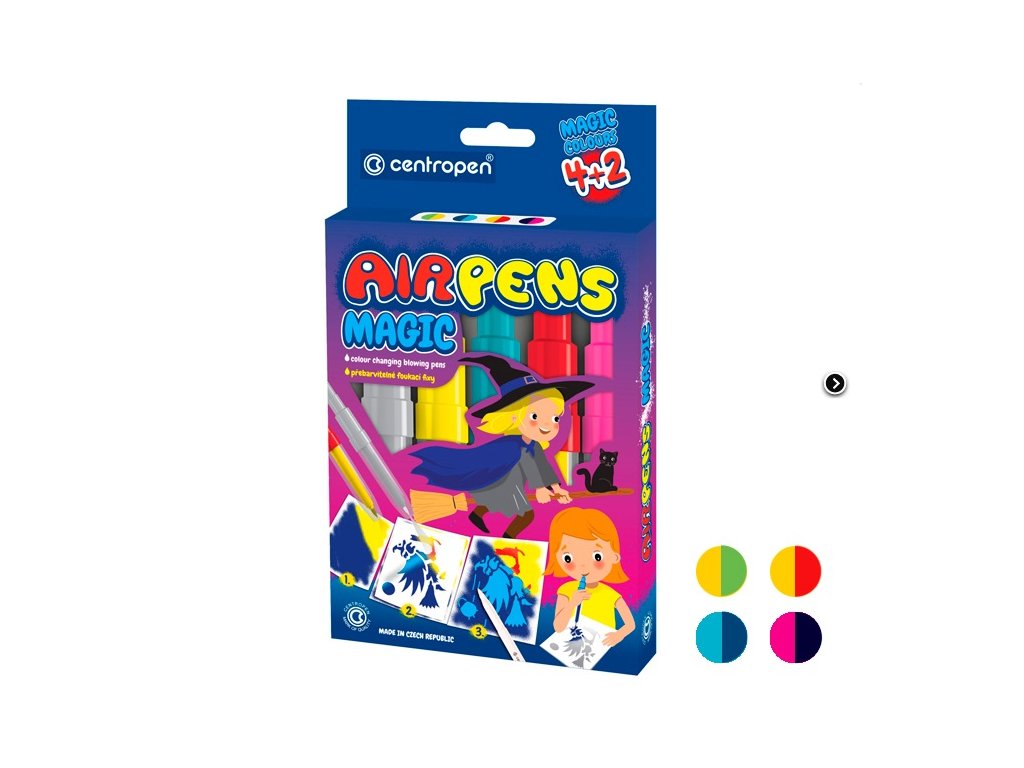 magické foukací fixy na papír • zdravotně nezávadný inkoust • inkousty přebarvitelné zmizíkem • 5 barevných odstínů • 1 klasický zmizík • 8 šablonPLU: 3489