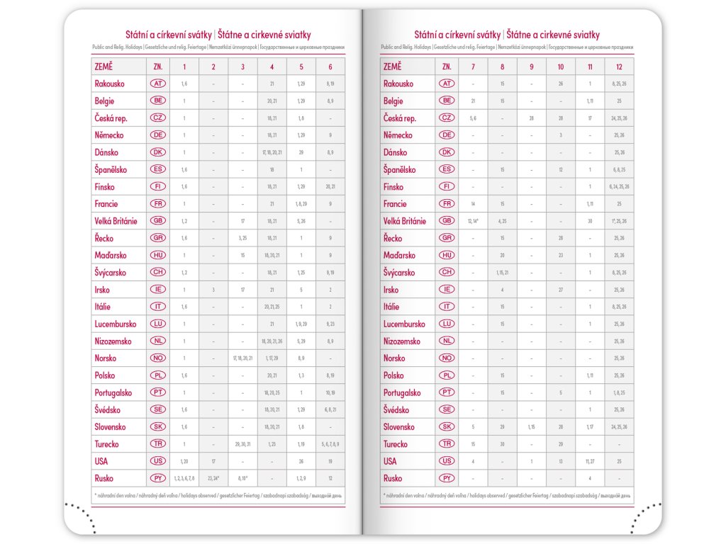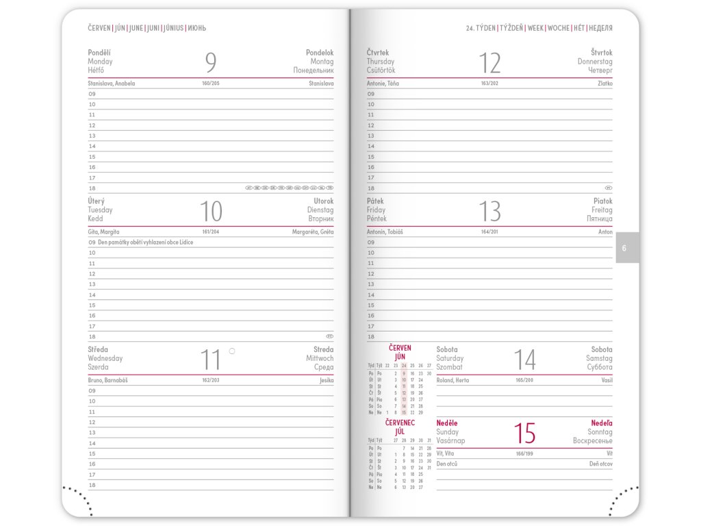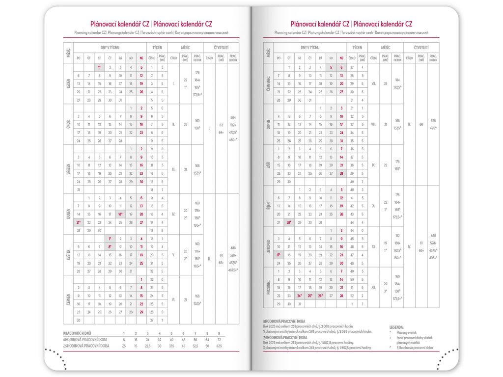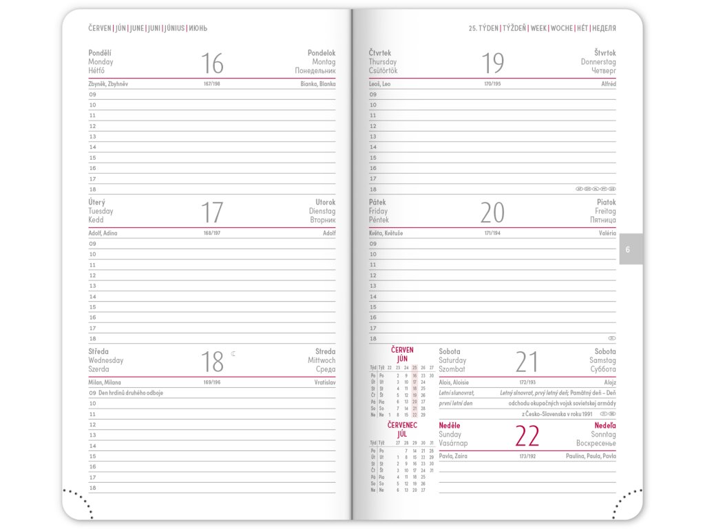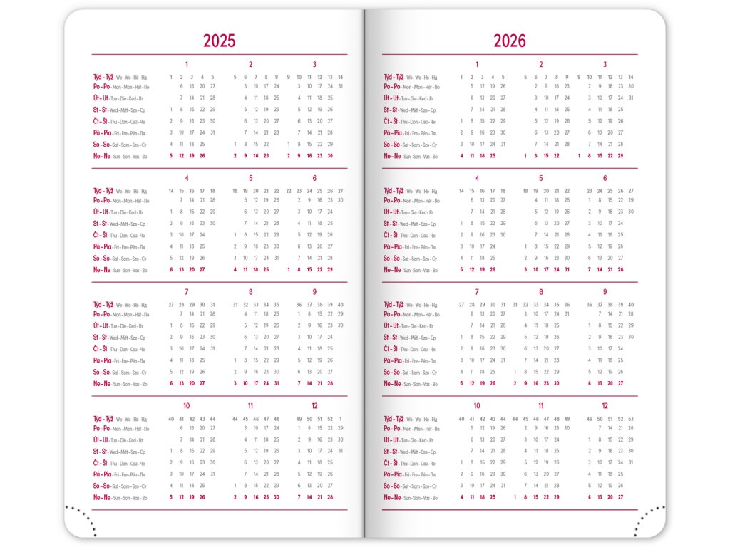 kapesní diář Aprint Neo 2025 v růžové barvě • rozšíření oblíbené řady Aprint o moderní variantu s kulatými rohy • kolekce Neo je zároveň navržena v nových trendy odstínech • i zde je možnost ražby letopočtu a loga • týdenní rozvrh s česko-slovenským kalendáriem a doplňkovou angličtinou, němčinou, maďarštinou a ruštinou • kalendárium od prosince 2024 • měsíční plánovací kalendář 2025 • měsíční plánovací kalendář 2026 • roční plánovací kalendář 2025–2026 • pracovní plánovací kalendář • svátky české a slovenské republiky a mezinárodní svátky • rozšířený seznam českých jmen • mapu české a slovenské republiky • místo pro osobní údaje • textilní záložka • perforované růžky • prostor pro poznámky • rozměr: 9 × 15,5 cm • PGD-KAPAN-5186PLU: 185597