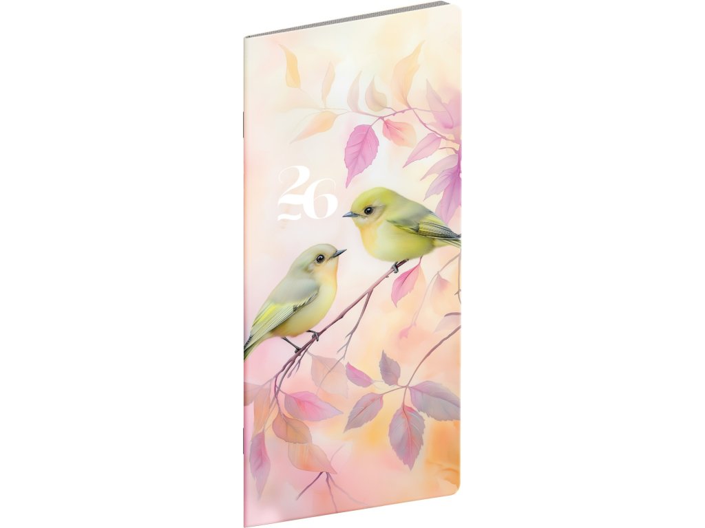 praktický tenký diář s motivem ptáků s měsíčním rozložením se vejde opravdu všude • obsahuje české kalendárium se jmény, svátky a památnými dny, pracovní kalendář, seznam jmen a přehled na rok 2026 a 2027 • rozměr: 8 x 18 cm • PGD-MESPL-35781PLU: 185913