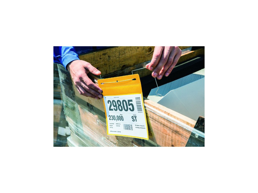 závěsné kapsy s drátěným pozinkovaným úchytem pro lehké a bezpečné upevnění • používají se na přepravních kontejnerech, kontejnerech s oky, dřevěných nosných rámech, či paletách • průhledná přední strana je vyrobena z odolného polypropylenu • rychlá výměna štítků, které lze skenovat bez nutnosti vyjímání z pouzdra • vhodné pro vnější použití, protože ochranná zástěrka chrání dokumenty před prachem a vlhkostí • štítky lze individuálně nadefinovat na www.duraprint.eu • 50 ks v balení • vnitřní rozměr 210 x 148 mm • rozměr 223 x 218 mm • formát A5 na šířku • barva žlutáPLU: 169561