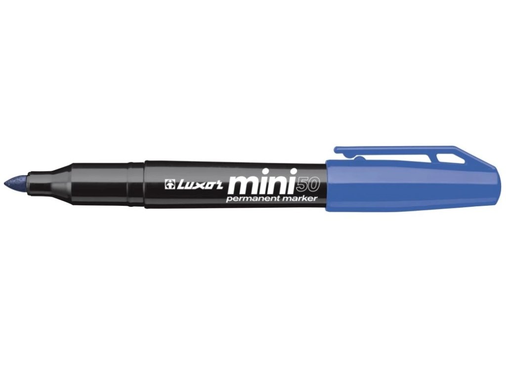 permanentní • kulatý hrot • extra pevný akrylový hrot • šířka stopy 1-2 mm • inkoust na bázi alkoholu • neobsahuje xylen ani toluen • nesmyvatelný, voděodolný • popisuje většinu povrchů • mini provedení o délce 6 cm • víčko s klipem • barva modrá • LUXOR 3002PLU: 9477