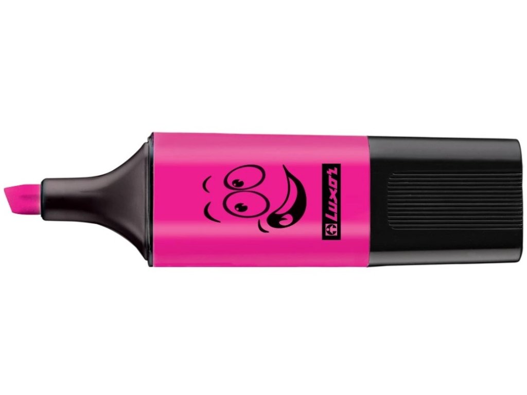 fluorescenční zvýrazňovač • seříznutý hrot • extra pevný plstěný hrot • šíře stopy 1-3,5 mm • barevná náplň na vodní bázi • smývatelné • mini provedení o délce 6,5 cm • ploché tělo • víčko lze nasadit na konce popisovače pro prodloužení • kapesní velikost • s potiskem obrázku veselého obličeje, který potěší • barva růžová • LUXOR 4033PLU: 12284