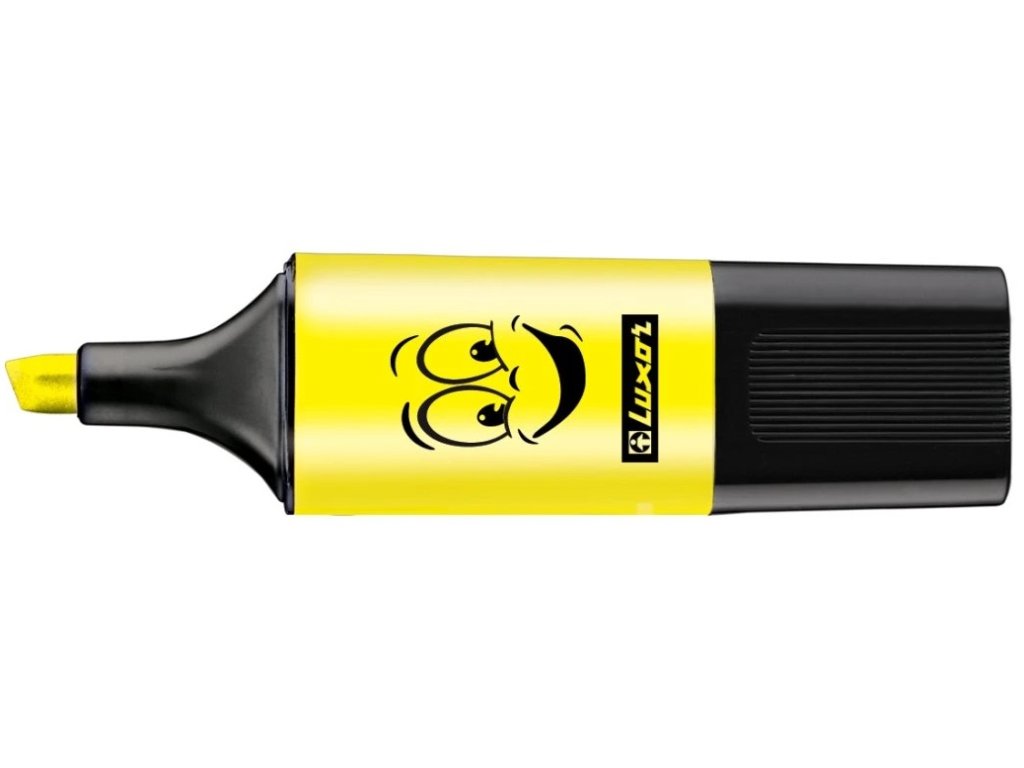 fluorescenční zvýrazňovač • seříznutý hrot • extra pevný plstěný hrot • šíře stopy 1-3,5 mm • barevná náplň na vodní bázi • smývatelné • mini provedení o délce 6,5 cm • ploché tělo • víčko lze nasadit na konce popisovače pro prodloužení • kapesní velikost • s potiskem obrázku veselého obličeje, který potěší • barva žlutá • LUXOR 4033PLU: 12286