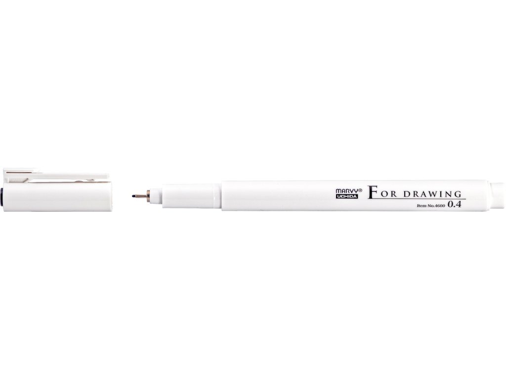 liner s černým pigmentovým inkoustem pro precizní stopu • hrot 0,4 mm • archivní kvalita, dokumentní stopa • vhodný pro vrstvení a i jako kontura k akvarelu • stabilní tok inkoustu, nepřerušovaná stopa • odolný hrot pro dlouhou životnost a čisté linie • inkoust na vodní bázi • MARVY For Drawing je ideální pro technickou kresbu, skicování, komiks, bullet journaling a kreativní projekty, vhodné do šablonek • MARVY M4600S-A 0,4PLU: 11106