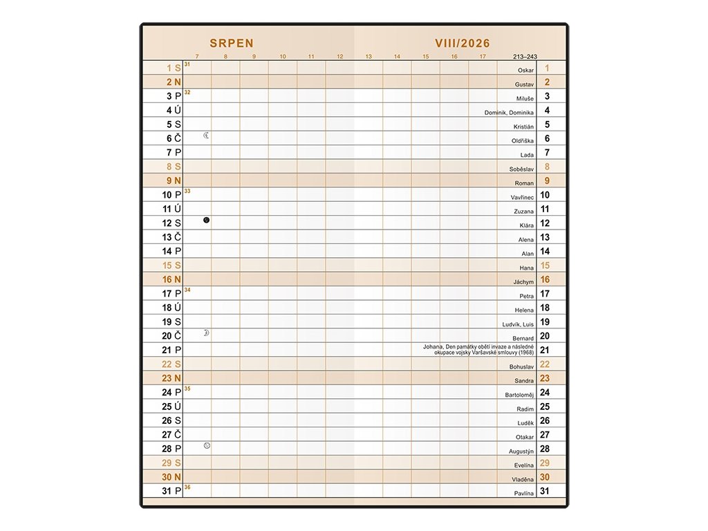 jednoduchý a praktický měsíční diář v kraftovém provedení s přírodním motivem • ideální pro každého, kdo si oblíbil měkkou šitou vazbu • kalendárium: časové rozmezí 7:00 - 17:00, měsíční fáze, roční období, letní a zimní čas, počet dnů • informační stránky: osobní záznamy, důležitá telefonní čísla, roční plánovací kalendář aktuálního roku, tabulkový kalendář aktuálního a následujícího roku, jmenný seznam, adresář • rozměr: 79x179 mm • BMB2-1-26PLU: 183653