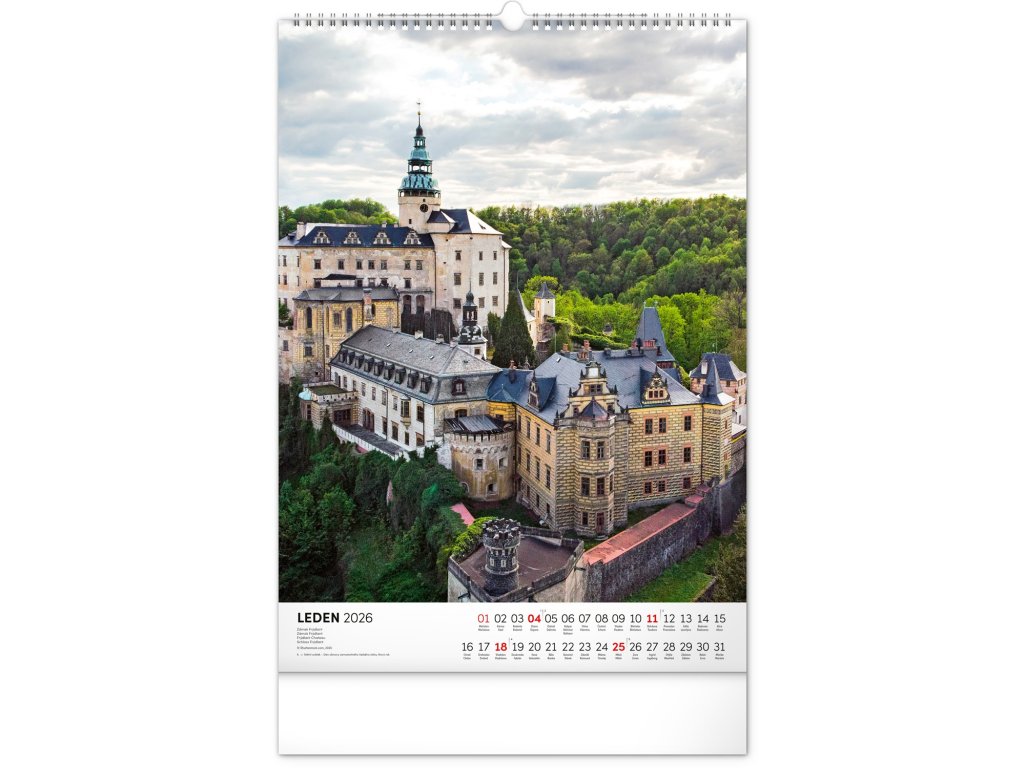 barevné fotografie Lokte, Lednice, Hluboké či Bouzova na stránkách nástěnného kalendáře ve výškovém formátu • jednoduché kalendárium s českými svátky a jmény • rozměr: 33 x 46 cm • PGN-35727-LPLU: 183807