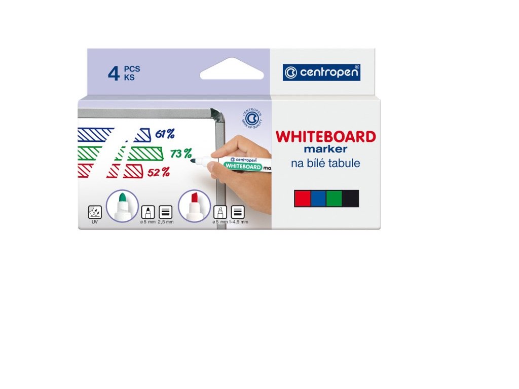 za sucha stíratelný, světlostálý • seříznutý hrot • šíře stopy 1 - 4,6 mm • ventilační uzávěry • na bílé tabule, PVC, sklo, porcelán • skladujte ve vodorovné poloze • 10 ks v baleníPLU: 190053