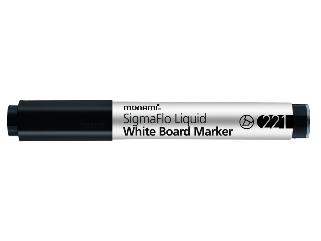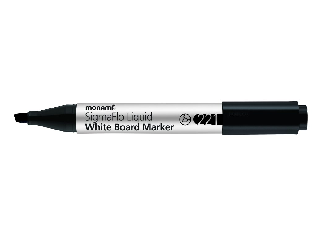 stíratelný popisovač s tekutým inkoustem • černý • klínový hrot • stopa 1 - 5 mm • SigmaFlo Liquid inovativní systém tekutého inkoustu v těle • 3x delší stopa • plynulé, syté a rovnoměrné značení až do poslední kapky • precizní stopa je sytá a přesná od začátku do konce • tekutý inkoust na bázi alkoholu • minimální ztráty inkoustu méně než 5% • snadno smazatelný suchým hadříkem nebo papírovou utěrkou • použití na většinu hladkých povrchů jako je bílá tabule, sklo, plast, keramika • možné použití v horizontálních i vertikálních polohách • kulaté tělo s vizuální kontrolou stavu inkoustu • šestihranné víčko s klipem k uchycení, zabraňuje skutálení • ideální pro detailní práci i profesionální použití • skvělá viditelnost • MONAMI 221-APLU: 19064