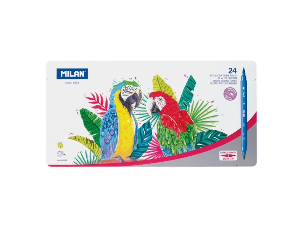 24 barev oboustranných fixů • jedna strana fixu: štětečkový hrot, který může vytvářet stopu od 0,5 mm do 4 mm jako malířský štětec • ideální pro kaligrafii, lettering a malování s různými tahy a mícháním barev • vláknový hrot • druhá strana fixu: tenký hrot 2 mm Ø vhodný zejména pro kreslení kontur a psaní jemnými tahy • barva na vodní bázi, která vytváří jasné a snadno nanášitelné odstíny, jež lze vzájemně míchat • lze snadno vyprat z většiny tkanin (před praním nechat hodinu namočené ve studené vodě a poté vyprat na studený program) • s perforovaným bezpečnostním víčkem • kovové pouzdro s vnitřní animací všech barev • MILAN 06161624PLU: 19043