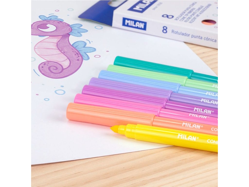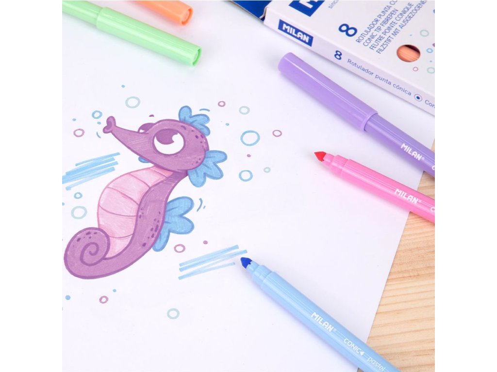vláknové fixy s kuželovitým hrotem o průměru 5 mm umožňují kreslit tahy od 0,75 mm do 3 mm, a jsou ideální pro vybarvování větších ploch i detailní práci • odolný kuželový hrot je navržen tak, aby zvládl i silnější tlak a nárazy – perfektní pro děti i intenzivní používání • vodou ředitelný inkoust, který vytváří syté, jasné a snadno roztíratelné barvy • barvy lze mezi sebou míchat a dosáhnout tak široké škály jemných odstínů • snadno pratelné z oblečení • perforovaný bezpečnostní uzávěr • 8 jemných pastelových odstínů: žlutá, oranžová, růžová, fialová, fialková, modrá, tyrkysová a zelená • MILAN 0612308PPLU: 17337