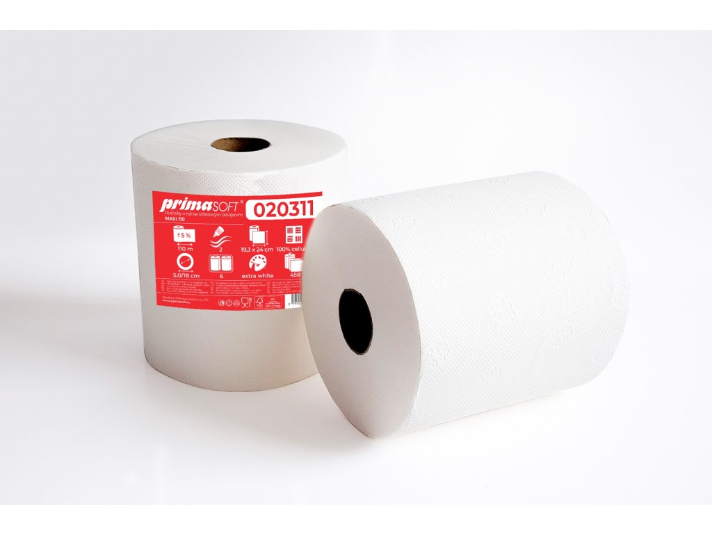 pro zásobníky se středovým odvíjením • dvouvrstvý • celulóza • extra bílý • výška role 19,5 cm • útržek 24 cm • provedení: Maxi • návin: 110 m • průměr: 18 cm • počet ks v bal.: 6 ksPLU: 310865