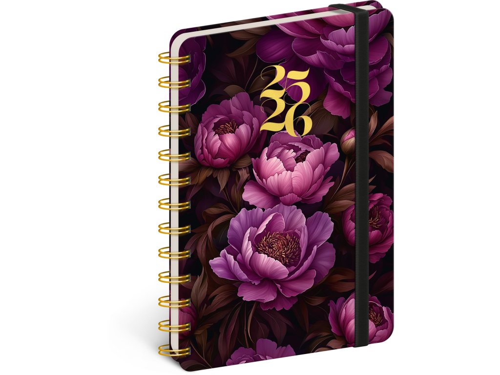 Spirálový 18měsíční diář Petito – Fialové květy 2025/2026, 13 x 18 cm