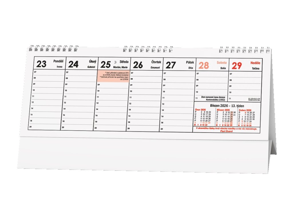 pracovní kalendář s citáty na každý týden • v praktickém formátu a s týdenním kalendáriem bude vašim pomocníkem • kalendárium: měsíční fáze, roční období, letní a zimní čas, tabulkový přehled 3 měsíců, citát na každý týden, daňové termíny CZ, časové plánování • informační stránky: tabulkový kalendář aktuálního a následujícího roku, plánovací kalendář aktuálního roku, státní svátky, ostatní svátky a významné dny, kalendář daňových povinností a poznámky • rozměr: 285x104 mm • vhodná technika potisku: sítotisk, UV tisk • BSB2-26PLU: 187768