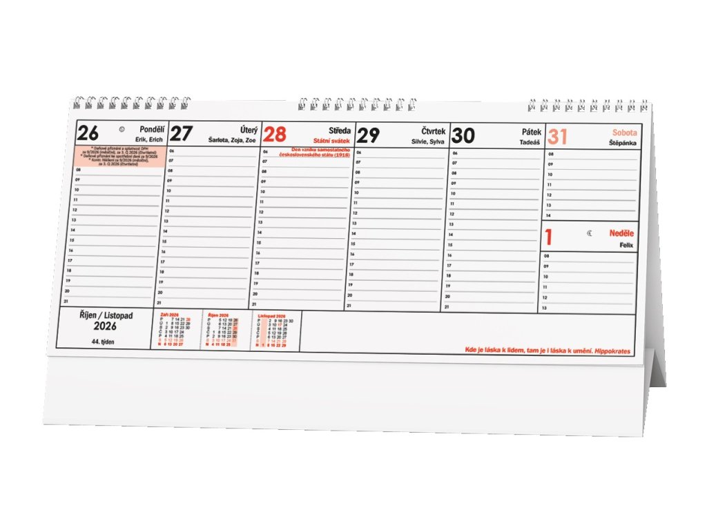 pracovní kalendář s citáty na každý týden • ve větším formátu a s týdenním kalendáriem bude vašim praktickým pomocníkem • kalendárium: měsíční fáze, roční období, letní a zimní čas, tabulkový přehled 3 měsíců, místo na poznámky, citát na každý týden, daňové termíny CZ, časové plánování • informační stránky: tabulkový kalendář aktuálního a následujícího roku, plánovací kalendář aktuálního roku, státní svátky, ostatní svátky a významné dny, kalendář daňových povinností a poznámky • rozměr: 320x140 mm • vhodná technika potisku: sítotisk, UV tisk • BSB3-26PLU: 187769