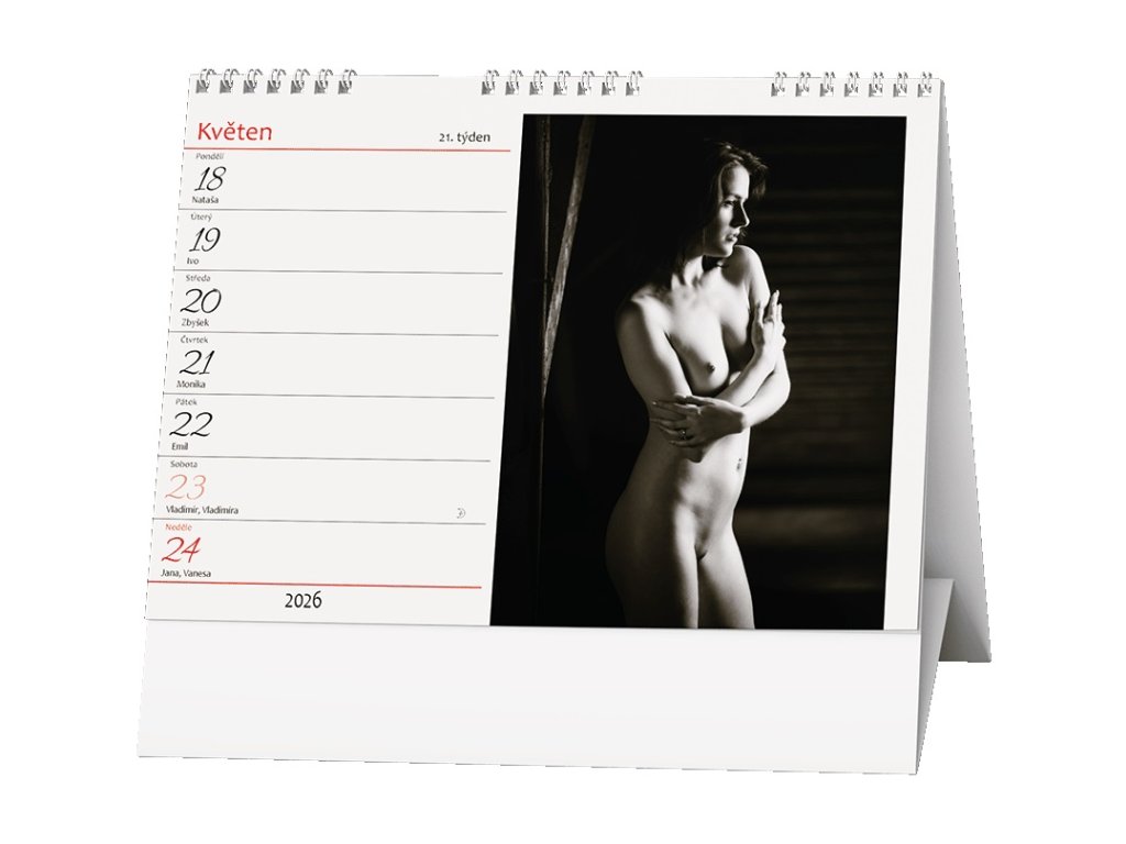 stolní kalendář s erotickými obrázky v černobílém stylu pro všechny muže • kalendárium: měsíční fáze, roční období, letní a zimní čas • informační stránky: státní svátky, ostatní svátky, významné dny, místo pro poznámky, tabulkový kalendář 2023 a aktuálního roku, plánovací kalendář 2023 • rozměr: 210x150 mm • vhodná technika potisku: sítotisk, UV tisk • BSE9-26PLU: 183700