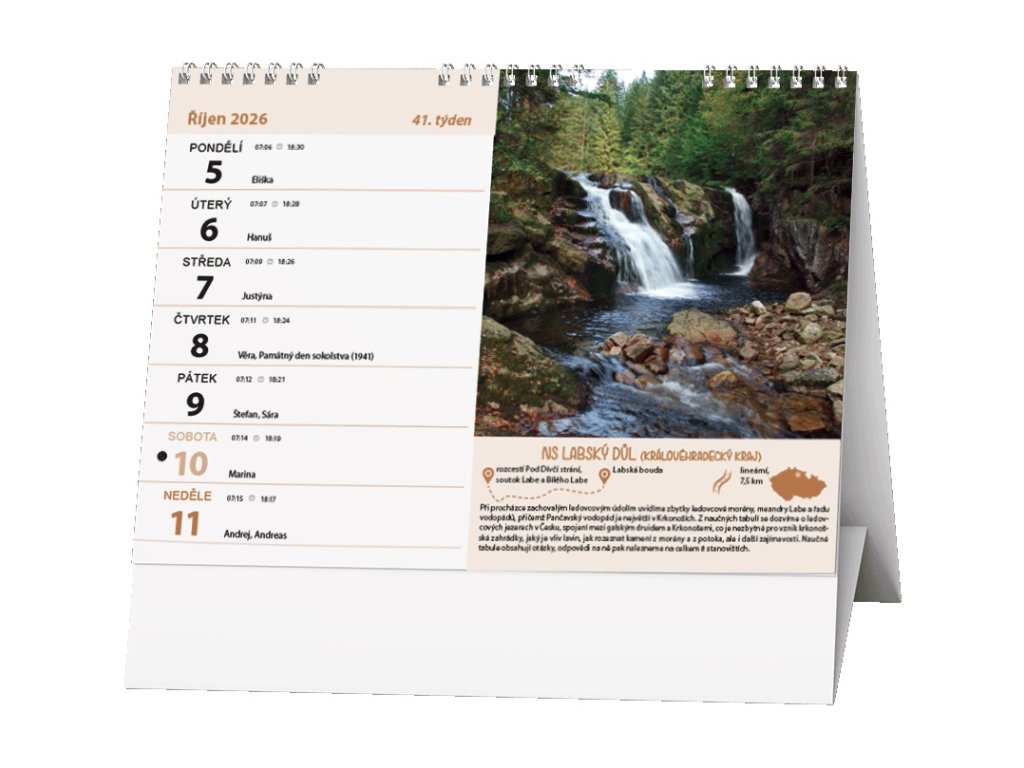 stolní kalendář s týdenním kalendáriem s informacemi o naučných stezkách v naší zemi • kalendárium: měsíční fáze, roční období, letní a zimní čas, čas východů a západů slunce, informace o naučných stezkách v ČR • informační stránky: státní svátky, ostatní svátky a významné dny, tabulkový kalendář aktuálního a následujícího roku, místo pro poznámky, narozeniny, výročí a svátky, východy a západy slunce v ČR, vysvětlivky k fázím měsíce • rozměr: 210x150 mm • vhodná technika potisku: sítotisk, UV tisk • BSH10-26PLU: 183096