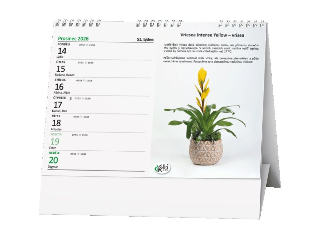 stolní kalendář s týdenním kalendáriem a s informacemi o péči o pokojové květiny • kalendárium: měsíční fáze, roční období, letní a zimní čas, čas východů a západů slunce, informace o pěstování pokojových květin • informační stránky: státní svátky, ostatní svátky a významné dny, místo na poznámky • rozměr: 210x150 mm • vhodná technika potisku: sítotisk, UV tisk • BSC7-26PLU: 187784