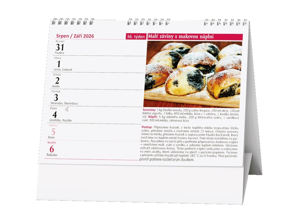 stolní kalendář s týdenním kalendáriem a s recepty pro oblíbená sladká jídla • kalendárium: měsíční fáze, roční období, letní a zimní čas, recepty • informační stránky: státní svátky, ostatní svátky a významné dny, tabulkový kalendář aktuálního a následujícího roku, místo pro poznámky, seznam receptů • rozměr: 210x150 mm • vhodná technika potisku: sítotisk, UV tisk • BSD11-26PLU: 187116
