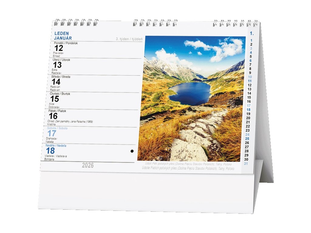 stolní kalendář s týdenním kalendáriem s obrázky hor našich sousedů na Slovensku • kalendárium: měsíční fáze, roční období, letní a zimní čas, sloupcový měsíční přehled • informační stránky: státní svátky, ostatní svátky a významné dny CZ/SK, místo na poznámky • rozměr: 210x150 mm • vhodná technika potisku: sítotisk, UV tisk • BSI3-26PLU: 183097