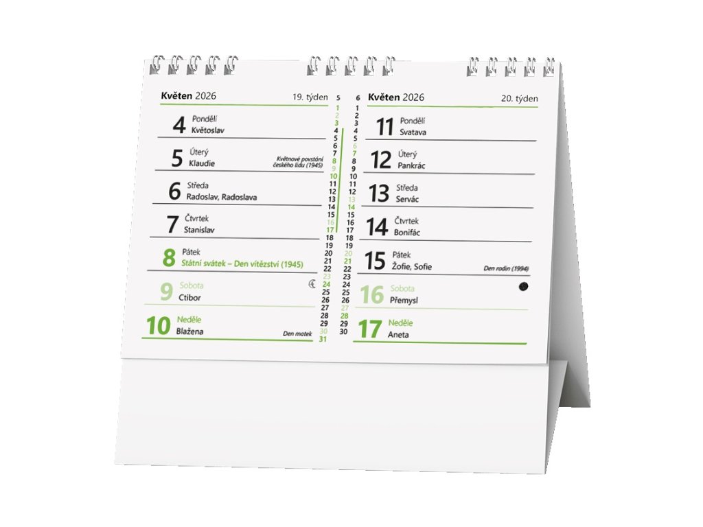 praktický stolní kalendář se čtrnáctidenním kalendáriem • malý formát a veselý motiv oživí váš den • kalendárium: měsíční fáze, roční období, letní a zimní čas, řádkový přehled 2 měsíců • informační stránky: státní svátky, ostatní svátky a významné dny a ostatní významné dny, tabulkový kalendář aktuálního a následujícího roku, plánovací kalendář aktuálního roku, místo pro poznámky • rozměr: 148x105 mm • vhodná technika potisku: sítotisk, UV tisk • BSA0-26PLU: 187760