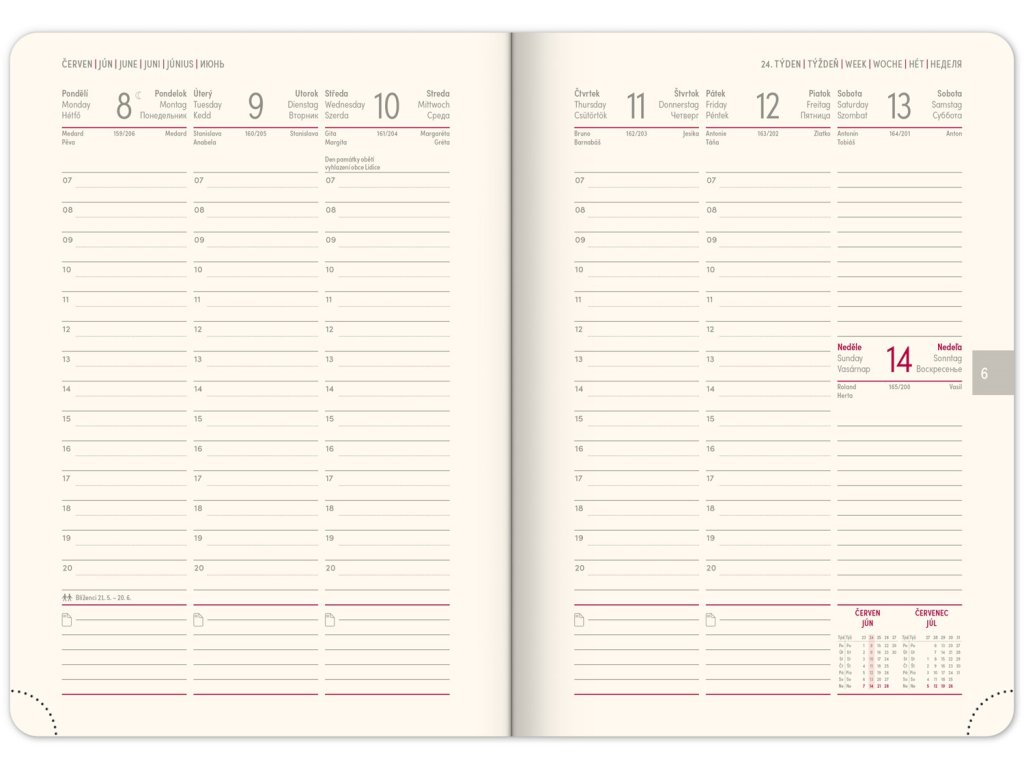 týdenní diář Diamante 2026 v modré barvě • povrch diáře má jemnou strukturu připomínající výbrus diamantu a je ideální pro všechny typy ražeb • diář má zakulacené rohy, poutko na tužku a elastickou gumičku • týdenní rozvrh s česko-slovenským kalendáriem a doplňkovou angličtinou, němčinou, maďarštinou a ruštinou • kalendárium od prosince 2025 • měsíční plánovací kalendář 2026 • měsíční plánovací kalendář 2027 • roční plánovací kalendář 2026–2027 • pracovní plánovací kalendář • svátky České a Slovenské republiky a mezinárodní svátky • rozšířený seznam českých jmen • mapa České a Slovenské republiky • místo pro osobní údaje • textilní záložka • perforované růžky • prostor pro poznámky • rozměr: 15 x 21 cm • PGD-TA5DI-6016PLU: 189969