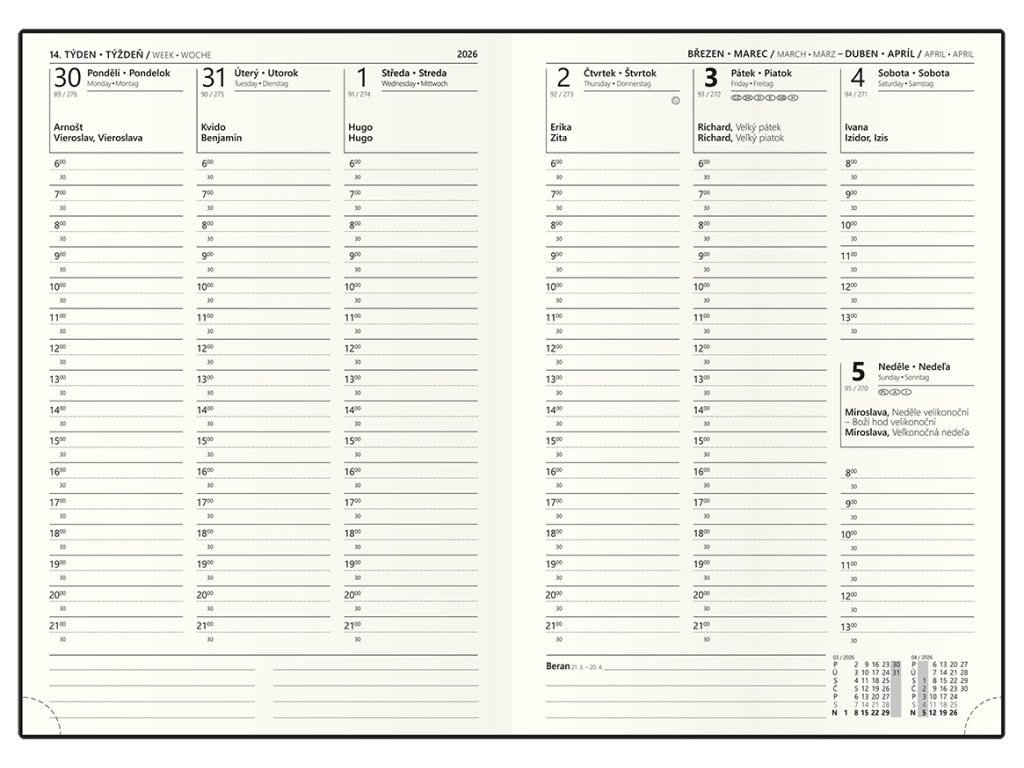 originální týdenní diář vyrobený z materiálu s přírodním motivem a moderní ražbou, která podtrhuje celý styl diáře • kalendárium: časové rozmezí: 6:00 - 21:30, měsíční fáze, roční období, letní a zimní čas, znamení zvěrokruhu, odpočet dnů, měsíční tabulkový přehled, dny a měsíce v 4 jazycích - CS, SK, EN, DE, mezinárodní svátky: CZ, SK, A, D, PL, H, GB, E, F, I, UA, místo na poznámky • informační stránky: osobní údaje, přehledný kalendář aktuálního roku a následujícího roku, měsíční plánování aktuálního roku, plán dovolených aktuálního roku, přehled státních svátků a významných dnů CZ/SK, jmenný seznam CZ/SK, daňový kalendář CZ/SK aktuálního roku, mezinárodní svátky, důležitá telefonní čísla, roční plánovací kalendář CZ/SK aktuálního roku, místo pro poznámky, mapa CZ/SK, zadní předsádka - kapsa • rozměr: 143x205 mm • vhodná technika potisku: ražba, ražba přes pásku • BTOk65-27-26PLU: 187066