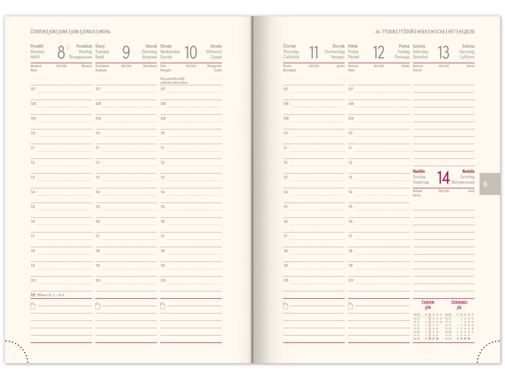 nová řada diářů s výrazným letopočtem • povrch má jemnou strukturu a je vhodný pro všechny typy ražeb • týdenní rozložení s česko-slovenským kalendáriem a doplňkovou angličtinou, němčinou, maďarštinou a ruštinou • kalendárium od prosince 2025 • měsíční plánovací kalendář 2026 • měsíční plánovací kalendář 2027 • roční plánovací kalendář 2026–2027 • pracovní plánovací kalendář • svátky České a Slovenské republiky a mezinárodní svátky • rozšířený seznam českých jmen • mapa České a Slovenské republiky • místo pro osobní údaje • textilní záložka • perforované růžky • prostor pro poznámky • rozměr: 15 x 21 cm • PGD-TA5PA-6335PLU: 185710