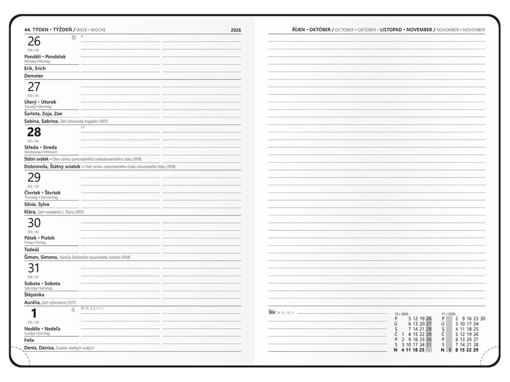 diář s týdenním kalendáriem na jedné straně a na druhé straně s prostorem na poznámky • desky jsou ohebnější, mají moderní ražbu, kulaté rohy a gumičku • kalendárium: měsíční fáze, roční období, letní a zimní čas, znamení zvěrokruhu, odpočet dnů, měsíční tabulkový kalendář, dny a měsíce v jazycích - CS, SK, EN, DE, mezinárodní svátky: CZ, SK, A, D, PL, H, GB, E, F, I, UA, velký prostor na poznámky • informační stránky: osobní údaje, přehledný kalendář aktuálního roku a následujícího roku, měsíční plánování aktuálního roku, plán dovolených aktuálního roku, přehled státních svátků a významných dnů CZ/SK, jmenný seznam CZ/SK, daňový kalendář CZ/SK aktuálního roku, mezinárodní svátky, důležitá telefonní čísla, roční plánovací kalendář CZ/SK aktuálního roku, místo na poznámky, zadní předsádka - kapsa • rozměr: 143x205 mm • vhodná technika potisku: ražba, ražba přes pásku, sítotisk • BTZ3-23-26PLU: 183944